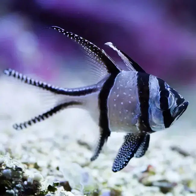 House the Banggai Cardinalfish in a well-filtered 30 gallon or larger aquarium aquascaped with a generous amount of live rock. Carefully arrange the aquarium landscape to create plenty of caves, overhangs, and crevices as well as an open area for swimming. House the Kaudern's Cardinal with peaceful tank mates as it is a slow and methodical swimmer. Groups of Banggai Cardinalfish can be kept in relative peace in larger systems with plenty of swimming and hiding spaces. Moderate water movement will also be appreciated by the Banggai Cardinalfish.