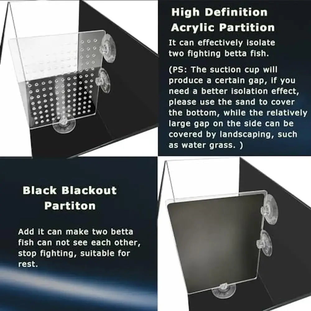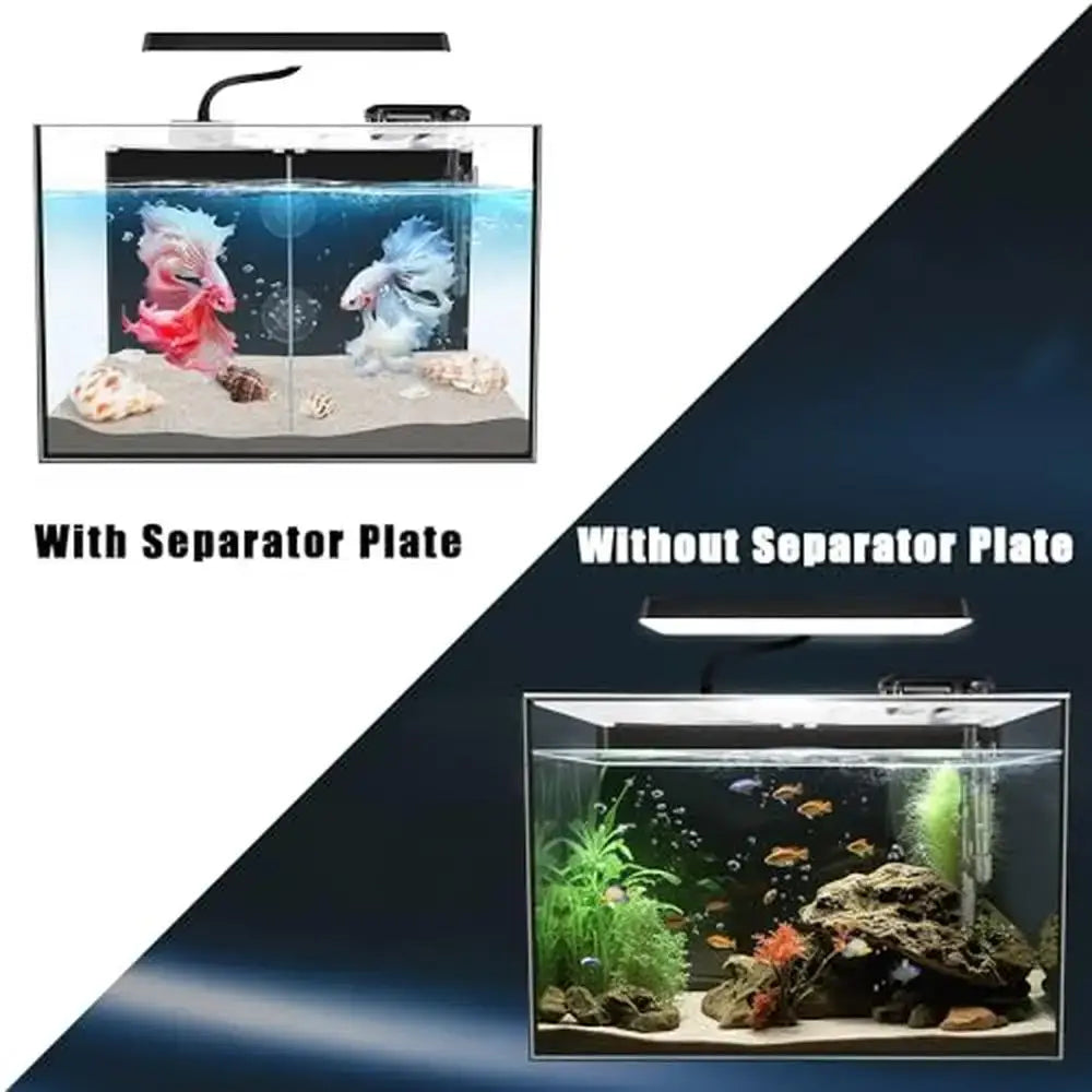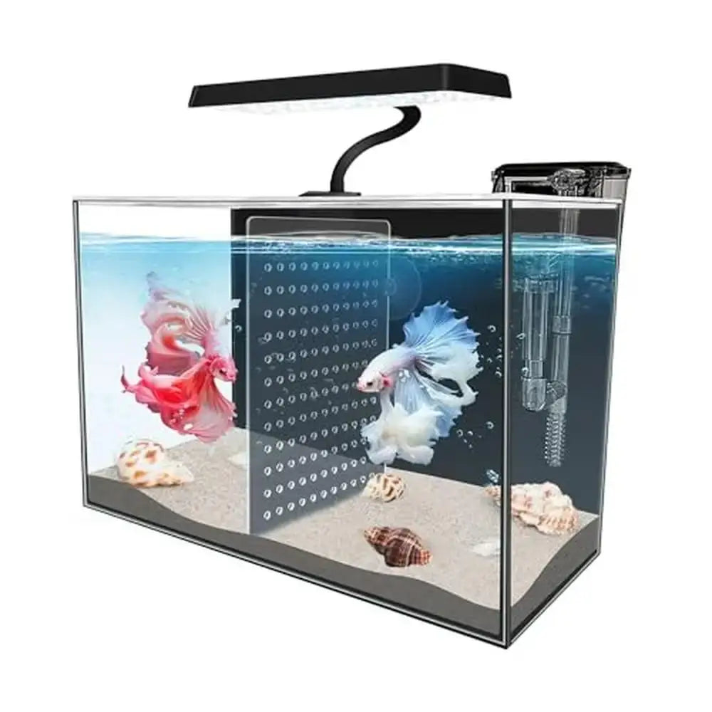 he Perfect Aquarium Betta Tank: A 3-gallon nano glass aquarium that's an absolute gem for aquarium enthusiasts! This rectangular beauty is tailor-made for Betta fish, guppies, angelfish, and other small, captivating aquatic companions. Equipped with LED lights, a hanging filter, and lids, we've even thrown in specialized dividers and shields—perfect for hosting two Betta fish, letting them swim with passion and rest in style.