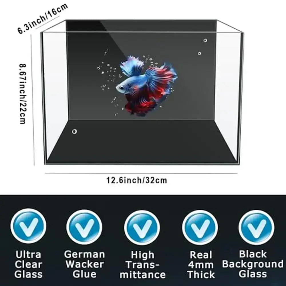 Sleek and Simple Design: Our tank measures 12. 6 inches in length, 6. 3 inches in width, and stands 8. 67 inches tall, boasting crystal-clear 4mm-thick glass. The back glass is chic black, and the bottom features a black EVA cushion, giving the tank an inherently sophisticated black look—perfect for your American-style home. We've also included a custom lid to prevent any fishy escape attempts.